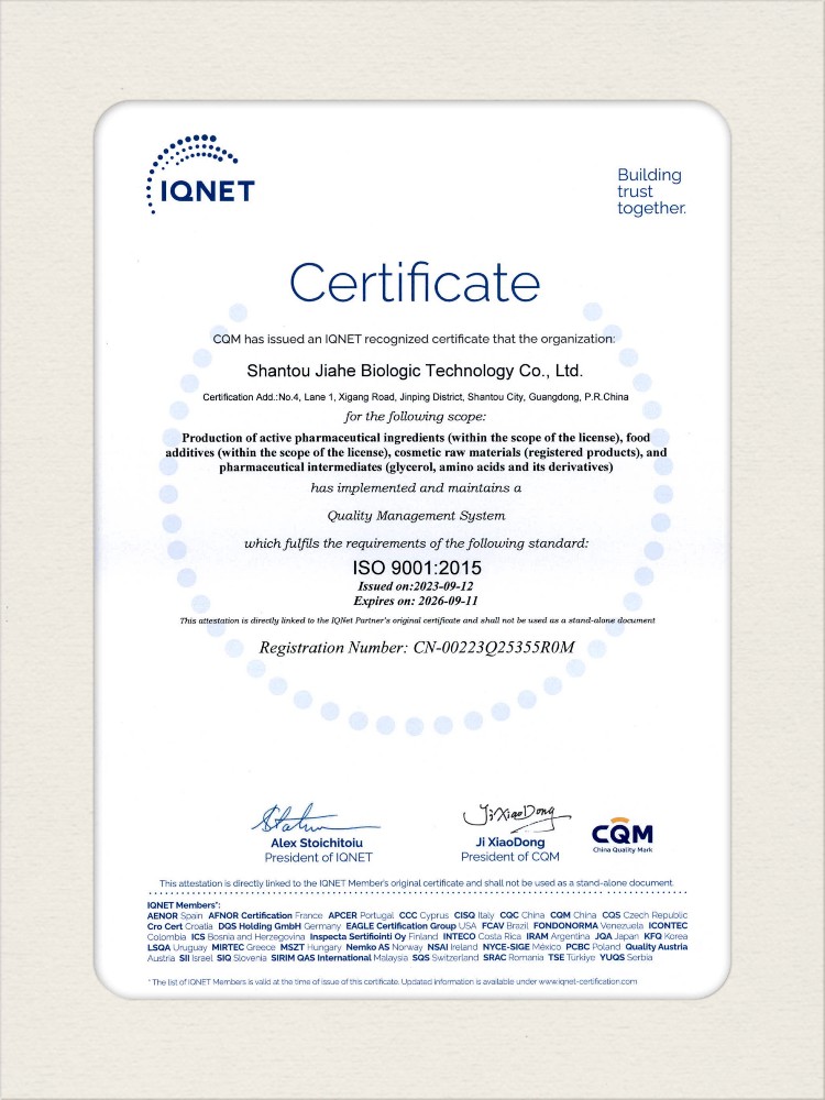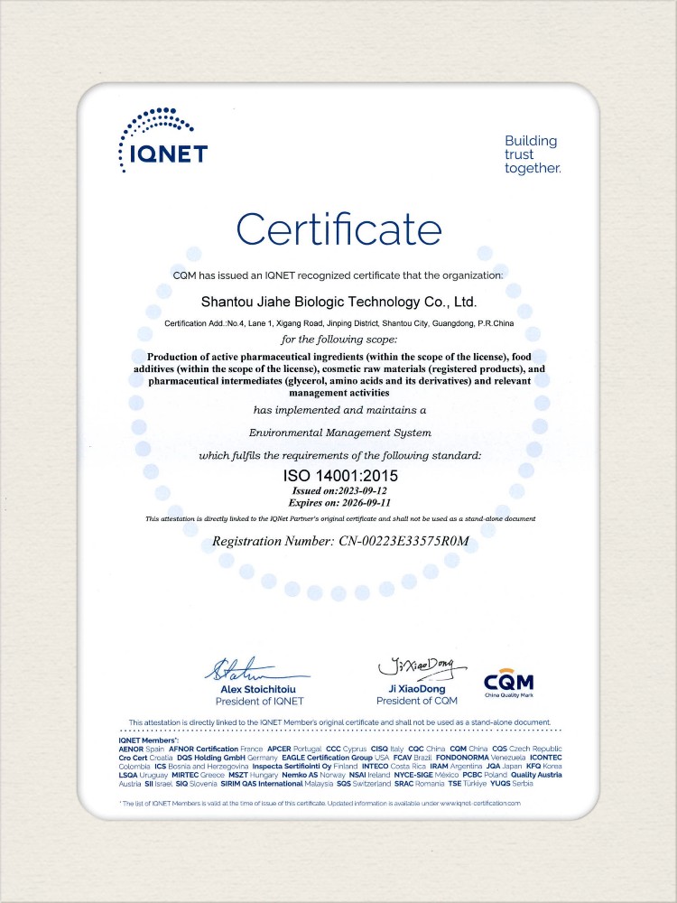汕頭佳禾生物科技有限公司是一家致力于氨基酸及其衍生物研發(fā)、生產(chǎn)和銷售的國(guó)家高新技術(shù)企業(yè),先后通過了國(guó)家藥品GMP認(rèn)證,ISO9001質(zhì)量體系認(rèn)證、ISO14001環(huán)境管理體系認(rèn)證。目前,公司擁有“廣東省專精特新中小企業(yè)”、“廣東省氨基酸產(chǎn)品工程技術(shù)研究中心”、“汕頭市生物發(fā)酵工程技術(shù)研究開發(fā)中心”、“汕頭市知識(shí)產(chǎn)權(quán)優(yōu)勢(shì)企業(yè)”、“多項(xiàng)國(guó)家發(fā)明專利”、“廣東省守合同重信用企業(yè)”等多項(xiàng)資質(zhì)和榮譽(yù),旗下“佳禾牌”系列產(chǎn)品已成為原料藥行業(yè)知名品牌。 新泰市佳禾生物科技有限公司成立于2012年8月,注冊(cè)資金2億元,公司位于山東泰安新泰市新汶工業(yè)園區(qū),是國(guó) 家級(jí)高新技術(shù)企業(yè)、山東省“專精特新”企業(yè)、山東省制造業(yè)單項(xiàng)冠軍企業(yè)、泰安市科技型中小企業(yè)、泰安市農(nóng)業(yè)產(chǎn)業(yè)化龍頭企業(yè)、中國(guó)生物發(fā)酵產(chǎn)業(yè)協(xié)會(huì)理事單位。